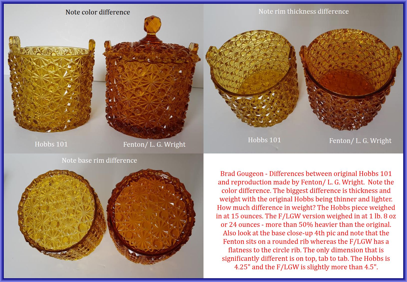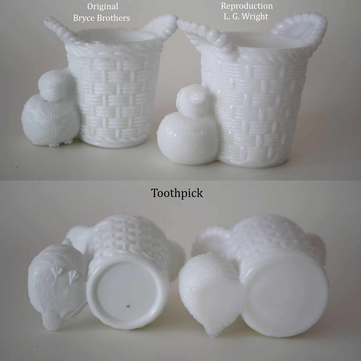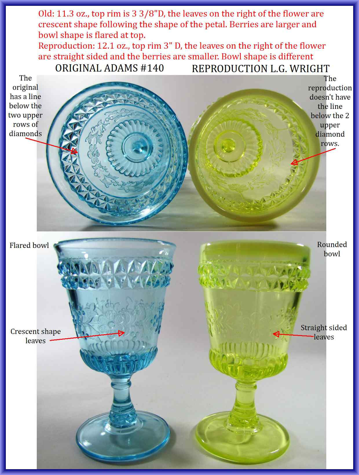 Contributor: Robert Nathan Korn - Original on left, LG Wright on right. Stippling very poor on reproduction. Ring where bowl meets stem is higher up on Adams than Wright.