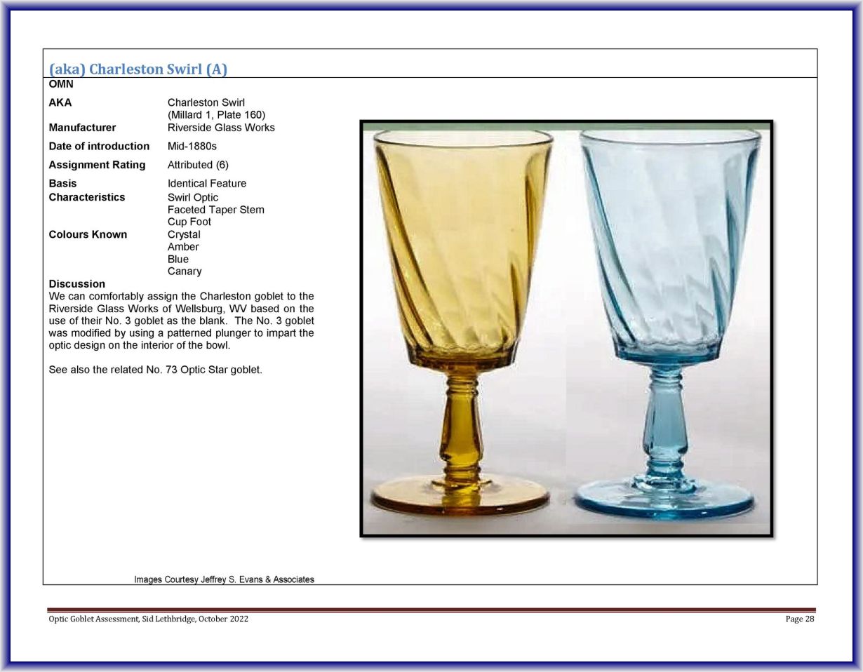 NOTE: We can comfortably assign the Charleston goblet to the Riverside Glass Works of Wellsburg, WV based on the use of their No. 3 goblet as the blank. The No. 3 goblet was modified by using a patterned plunger to impart the optic design on the interior of the bowl.