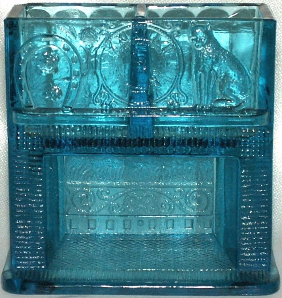 NOTE: Richard Ryan - It is a fireplace with a horseshoe, clock and kitten on the mantle. Incredible detail. This was likely made sometime between 1885 and 1895 in the USA. Certain that it would have been made in amber, clear and possibly Vaseline. It has a side for used and unused matches.