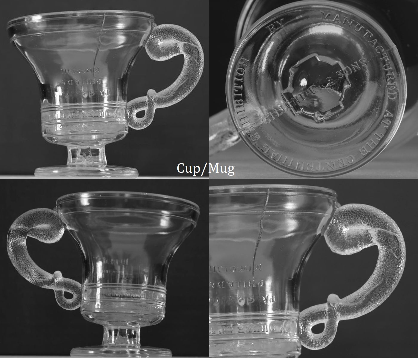 NOTE: Elaine Huddleston Henderson: This is the rare LIBERTY BELL aka CENTENNIAL mug. It is 3 3/8" diameter at the top and 3 5/8" high & was manufactured on site at the Philadelphia Centennial Exhibition in 1876…. Around/ under the base perimeter “MANUFACTURED AT THE CENTENNIAL EXHIBITION BY” and in the base center “GILLINDER & SONS”.