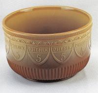 • NOTE: George W. Huffman Phenix V - a nerve beverage circa 1900s. Sold in bottles as a tonic. This chocolate glass punch bowl was probably a promotional counter display. Phenix V glasses exist in crystal often found in metal holders. Maker is currently unknown.